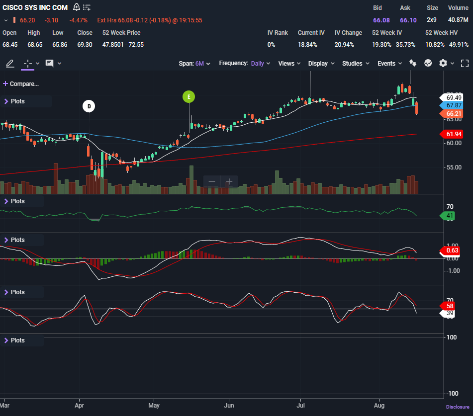 This is a failed breakout turned pullback. Until CSCO reclaims 67.9ā69.5, short-term sellers have control.