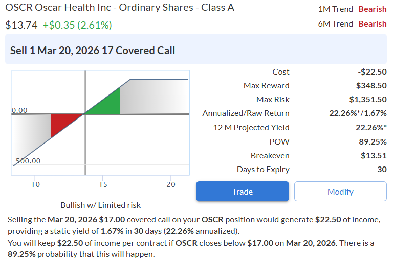 Given that backdrop, Iโm managing the position by writing a covered call to generate income while the stock works to appreciate. This allows me to collect premium up front, lower my effective cost basis, and stay disciplined as the setup develops.