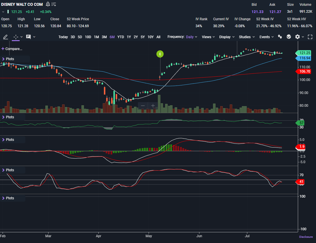 $DIS is currently trading around $121.25, breaking above the 10-day SMA, which is curled slightly upward. The 50-day SMA sitting at $116.94 is still trending nicely and offering support below. The 200-day SMA? Way down at $106.70, which tells you how far weāve come since the March lows.
