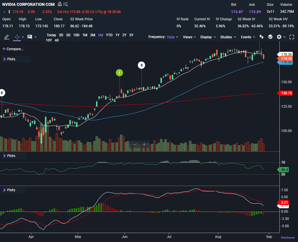 Price Action & Candles: NVDA closed Friday at $174.28, down nearly 6 bucks on the day. After running hot into earnings, it’s now pulling back, testing its 50-day moving average zone.