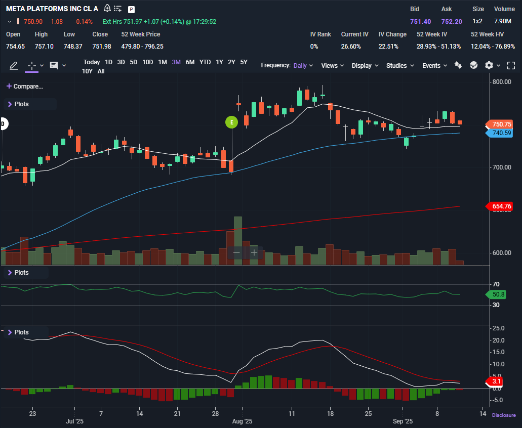 Price Action: META closed at $750.90 after a tight session. The candles show balance between bulls and bears, but importantly, no heavy selling pressure.