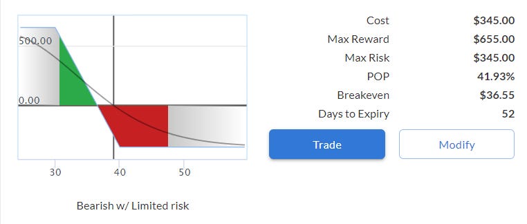 This is a bearish strategy with a limited risk of $345.00 and a limited potential reward of $655.00. This strategy will profit if the stock closes below $36.55 by Jun 21, 2024. There is a 41.93% probability this will happen.