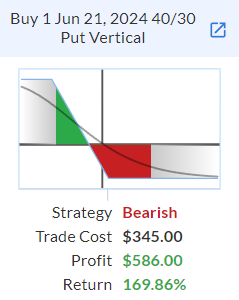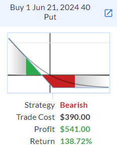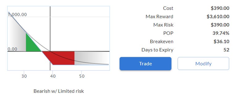 This is a bearish strategy with a limited risk of $390.00 and a limited potential reward of $3,610.00. This strategy will profit if the stock closes below $36.10 by Jun 21, 2024. There is a 39.74% probability this will happen.