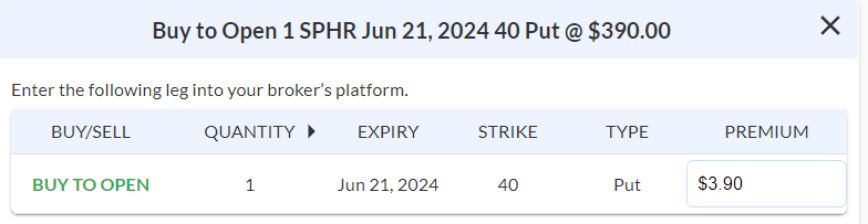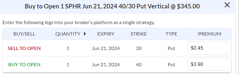 $SPHR is bearish with a wide window to support if It can break down below its 200-day MA. I'm going to risk $345.00 per contract for a potential $586.00 profit, a 169.86% return.