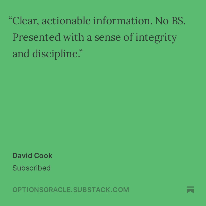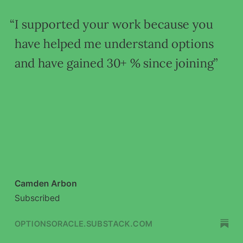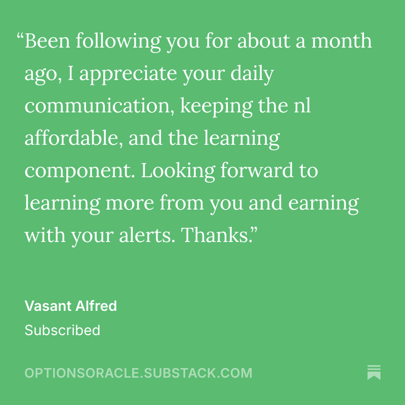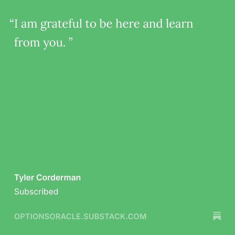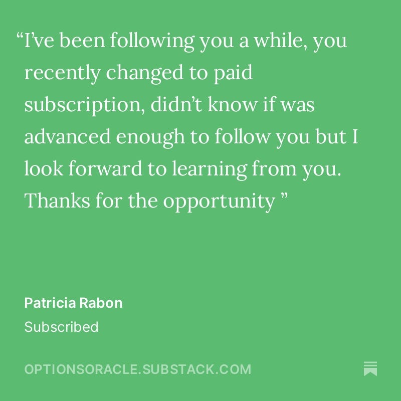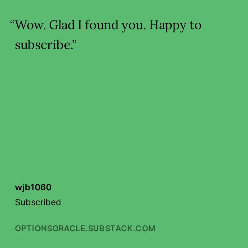 Thank you for taking the time to share your stories and experiences. Your feedback helps this publication to grow, improve, and strive to exceed your expectations continually. I am committed to maintaining the high standards that you have come to expect from The Options Oracle.