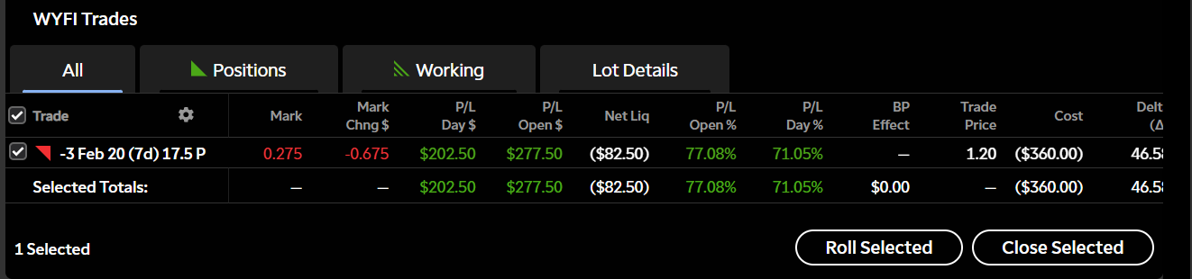 WYFI had a strong move higher and crushed premium fast. With over 77% already captured and only a week left, I’m taking the profit here and locking in the win. No need to sit around for the final stretch of premium when the majority of the work is done. Capital now gets freed up for the next setup.