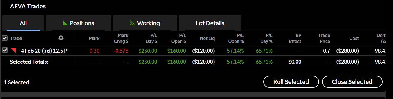 AEVA performed well and moved in the right direction. While premium isn’t as compressed as WYFI, over 57% captured in a short window is a solid return. I’d rather step aside here, take the win, and avoid unnecessary event risk. I can always rotate back in if the setup lines up again.