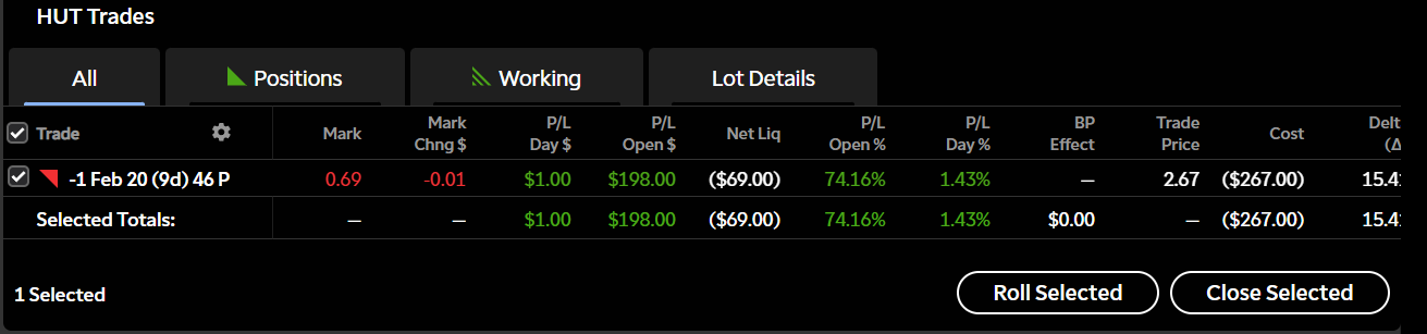 HUT was a shorter-term trade than usual to begin with that I wanted to put it before earnings. With over 74% of the premium already captured, I’m taking the win here and adding it to the gains I’ve already stacked on this name. I’ll keep it on my watchlist to see how it reacts to earnings and if a clean setup presents itself again, I won’t hesitate to rotate back in.
